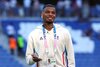 LYON, FRANCE - AUGUST 05: Andy Diouf #20 of Team France inspects the pitch prior to the Men's semifinal match between France and Egypt during the Olympic Games Paris 2024 at Stade de Lyon on August 05, 2024 in Lyon, France